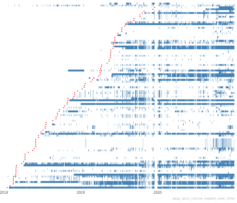 The figure shows actual exploit observations for a sample of vulnerabilities. Each row represents a separate vulnerability (CVE), while each blue line represents an observed exploit. The red dots represent the time of public disclosure of the CVE. (Note that we are not tracking whether these exploits are successful or not.) While it is difficult to draw conclusive insights from these behaviors, we can comment on general characteristics. First, simply viewing these data is interesting because they provide a novel view into real-world exploit behavior. Indeed, it is exceedingly rare to see these kinds of data publicly available, and we are fortunate to be able to share them with you. It is also thought-provoking to examine and consider the different kinds of exploit patterns, such as: